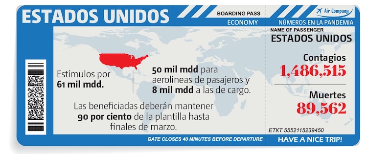 En el caso del gobierno de Donald Trump, el Congreso aprobó un paquete de apoyos por 61 mil millones de dólares, 50 mil mdd para aerolíneas de pasajeros y 8 mil para las de carga.
