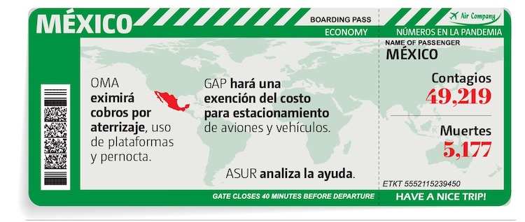 OMA, que administra 13 aeropuertos, informó que eximirá ciento por ciento el cobro por aterrizaje, uso de plataformas de embarque y desembarque y estacionamiento prolongado de equipos (pernocta). Además condonará en su totalidad los pagos de revisión de pasajeros y equipaje de mano, así como de uso de aerocares (camiones que transportan a pasajeros del avión a las terminales) y pasillos telescópicos.
