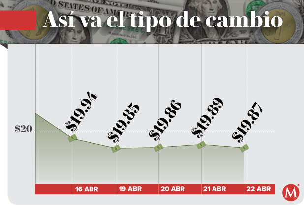 El Banco de México (Banxico) registró la sesión previa un tipo de cambio de 19.87 pesos por dólar.