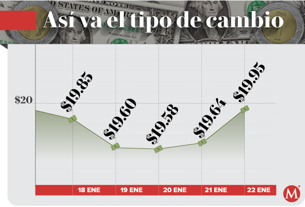 Banco Base explicó en un reporte que el tipo de cambio toca un máximo de 19.95 pesos borrando por completo las ganancias de los primeros tres días de la semana. Esto se debe a un regreso de la aversión al riesgo en los mercados financieros globales, por lo que el índice ponderado del dólar muestra un avance de 0.36 por ciento, luego de caer durante las cuatro sesiones previas.