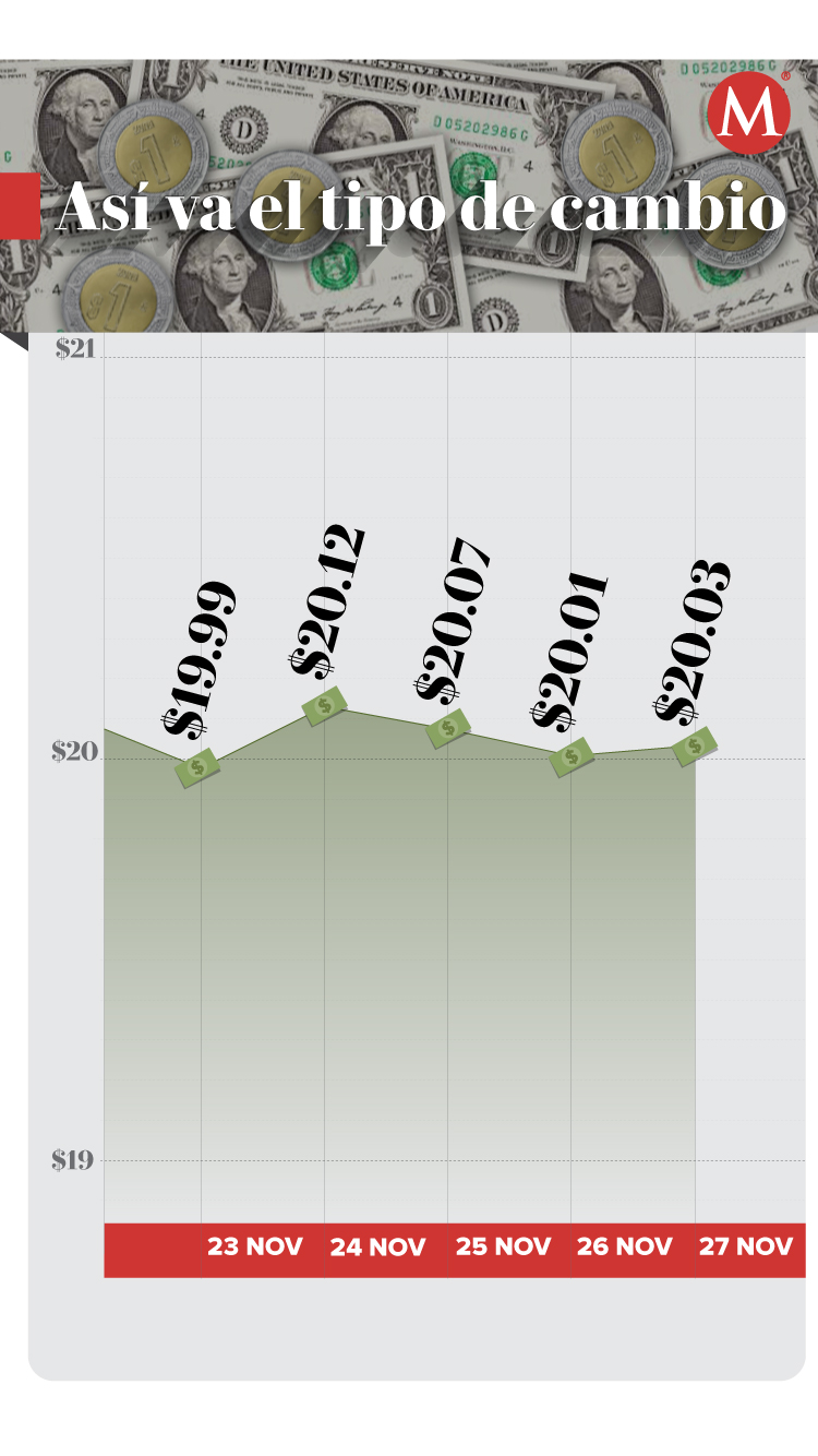 El Banco de México (Banxico) registró la sesión previa un tipo de cambio de 20.04 pesos por dólar.