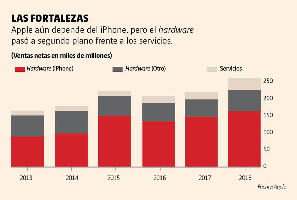 Sin embargo, es posible que no importe. Apple todavía depende del iPhone y, sin duda, quiere tener el mejor teléfono de la industria, pero el hardware pasó a un segundo plano frente a los wearables •Apple Watch, AirPods y Beats• y los servicios, donde más de 420 millones de personas se suscriben a una gran variedad de productos, desde música hasta películas.