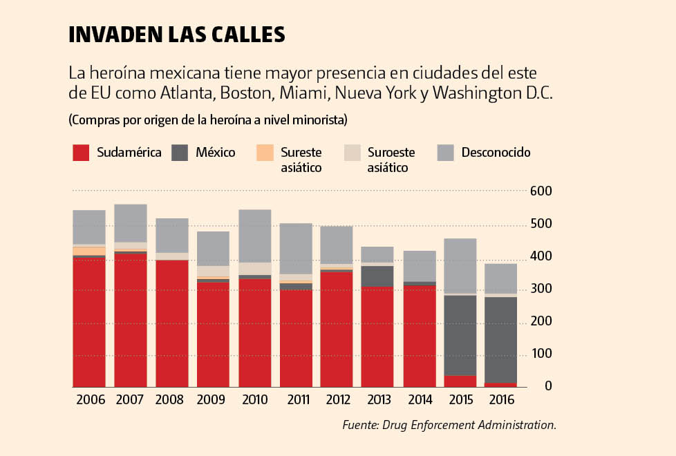 La Administración de Control de Drogas de EU (DEA, por sus siglas en inglés) estima que la producción de heroína mexicana se elevó 37% para llegar a 111 toneladas en 2017.