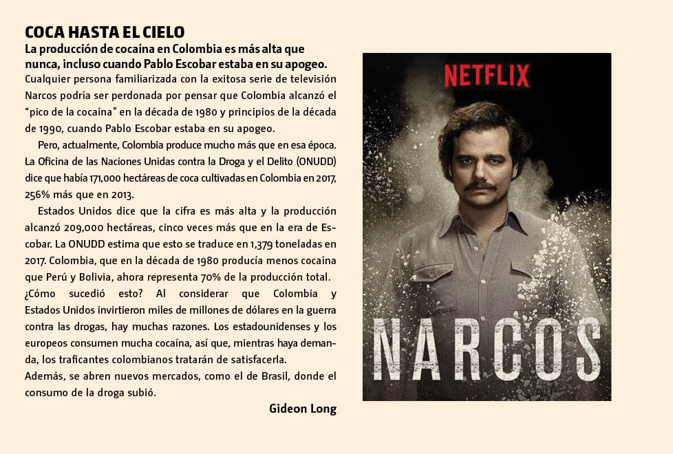 “Según las estimaciones del gobierno de EU, las utilidades de entre 19,000 y 39,000 millones de dólares (mdd) por las drogas ilícitas que regresan a México cada año y un mercado de 150,000 mdd en EU, crearán una atracción gravitacional y las condiciones para las actividades del crimen organizado en México”, dice Bruce Bagley, experto en cárteles de la Universidad de Miami.