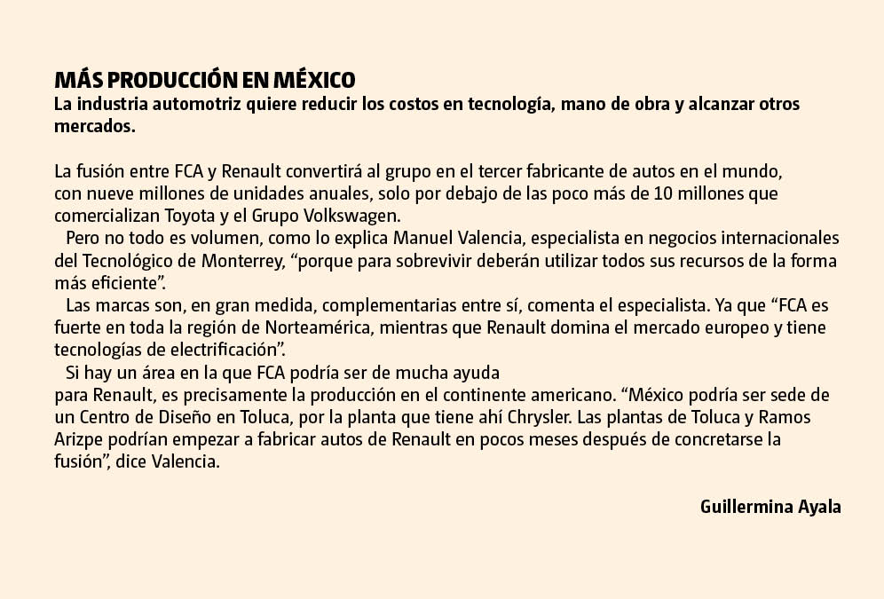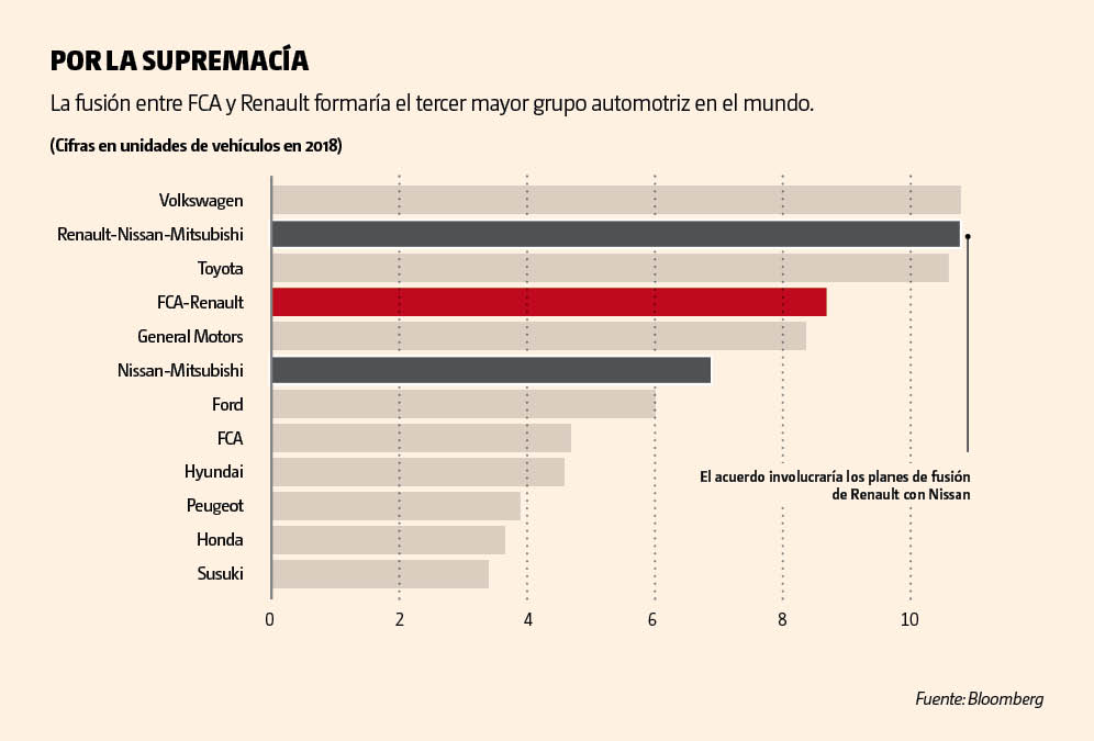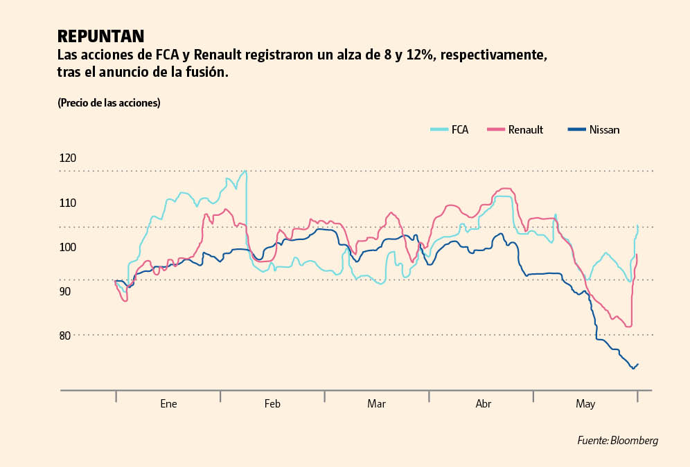 La entidad fusionada entre FCA y Renault tendría un valor de mercado de más de 35,000 mde, con base en el precio de las acciones del lunes pasado.