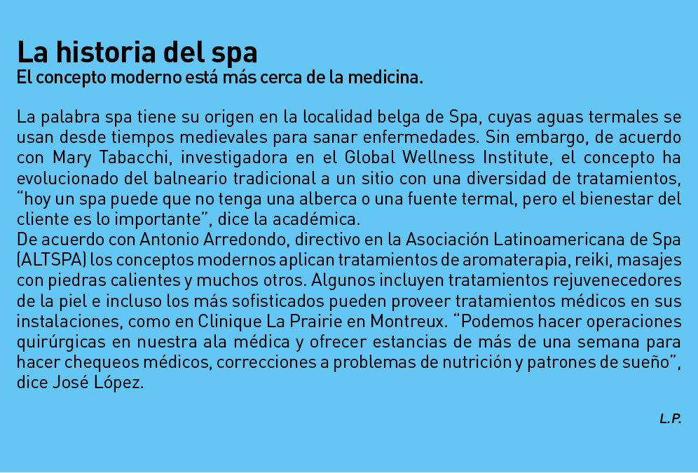 El negocio del spa crece de acuerdo con el acelerado ritmo de las tendencias que cambian vertiginosamente, según Yvette Thüring, gerenta general de Le Mirador, spa y hotel ubicado en la localidad suiza de Le Mont - Pèlerin, “el spa en Suiza estuvo relacionado históricamente con el descanso, pero se ha diversificado para incluir actividades físicas y mejorar el bienestar con nuevas prácticas como yoga y alimentación saludable”. Gustavo González, cirujano plástico en la Ciudad de México, ofrece a sus pacientes un spa que ayuda a la recuperación. “Cuando un paciente pasaba por un procedimiento como una liposucción, lo enviaba a un spa, pero hace 11 años instalé cabinas en mi consultorio para dar tratamientos como drenajes linfáticos y tratamientos con ultrasonido”.