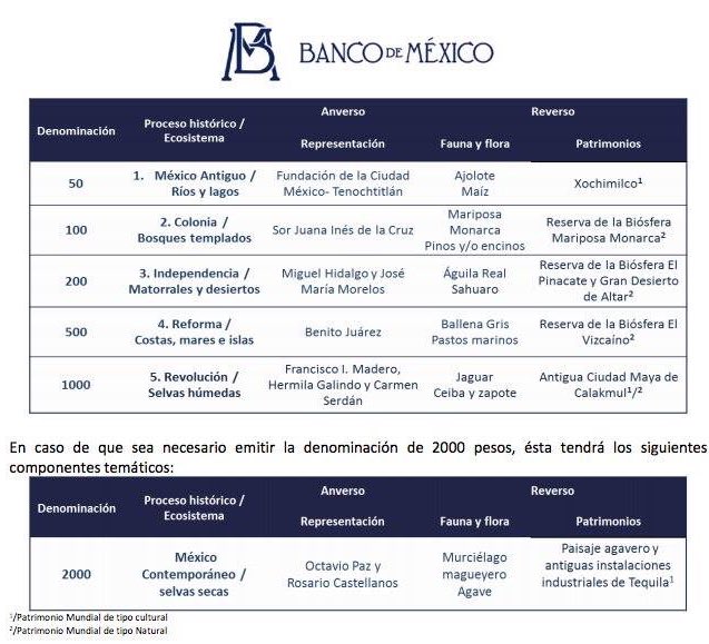 La imagen de la nueva familia de billetes "tendrá paisajes de los seis procesos históricos que nos forjan como nación tales como la época prehispánica, la colonia, Independencia, la restauración de la República, la Revolución y la época contemporánea", declaró Alegre.
