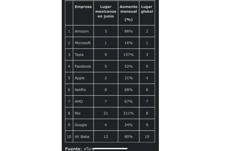 Amazon ocupó el primer lugar entre las acciones preferidas por los mexicanos, con un incremento de 86 por ciento en la plataforma respecto de junio. La acción ha crecido en las preferencias de los connacionales un 302 por ciento, en comparación con julio de 2020. Le siguen Microsoft, con un aumento de 16 por ciento respecto de junio, que el mes pasado estaba a la cabeza de la lista mexicana.