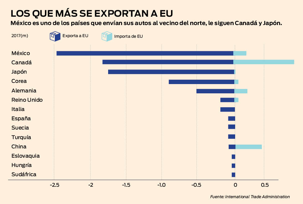 Sin embargo, México y Canadá, que tienen un acceso libre al mercado a través del Tratado de Libre Comercio de América del Norte, un tratado que el presidente quiere modificar son, por mucho, los que más contribuyen a esto, ya que representan 4.27 millones de vehículos importados y 1.07 millones de coches exportados. Japón y Europa dominan el resto del comercio automotriz de EU, pero en términos generales el país americano exporta coches más caros, y entran modelos más baratos.