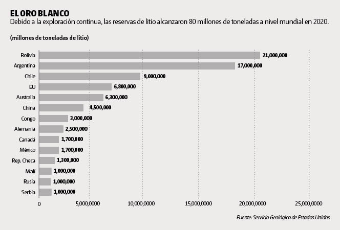 Para dimensionar el tamaño que tendría el yacimiento mexicano en manos de empresa privadas, según datos del Servicio Geológico de EU, las reservas de litio alcanzan 80 millones de toneladas a nivel mundial, las cuales están distribuidas de la siguiente forma: Bolivia 21 millones de toneladas, Argentina 17 millones, Chile 9 millones, Estados Unidos 6.8 millones, Australia 6.3 millones, China 4.5 millones, Congo 3 millones, Alemania 2.5 millones, Canadá y México 1.7 millones cada uno, República Checa 1.3 millones, Malí, Rusia y Serbia un millón de toneladas, respectivamente.