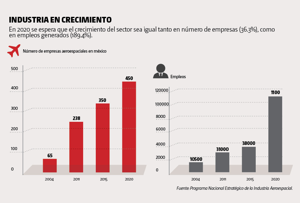 En solo 10 años, la industria aeronáutica de México ha tenido un crecimiento exponencial: de 60 empresas en 2005 llegó a más de 330 en 2018. Las importaciones crecieron anualmente a una tasa de 14.5%, en promedio.