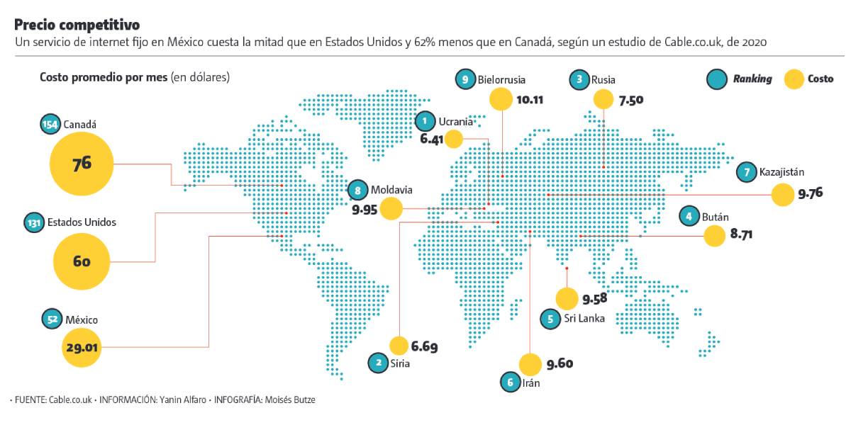 Conectarse a internet en México cuesta la mitad que en Estados Unidos y 62 por ciento menos que en Canadá. Según un estudio realizado en 2020 por Cable.co.uk, un sitio británico de análisis de internet de banda ancha, en el país cuesta 29 dólares (aproximadamente 580 pesos) contratar un servicio de internet fijo al mes.