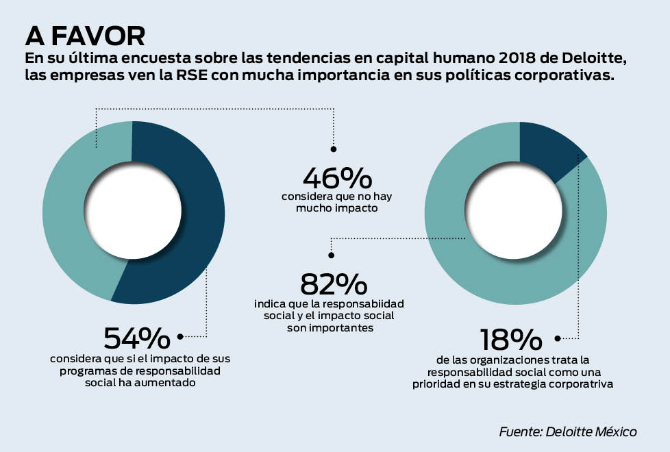 De acuerdo con el informe “Tendencias Globales en Capital Humano 2018”, de Deloitte, en el país poco más de 8 de cada 10 ejecutivos, 82%, define como un tema muy importante la decisión de impulsar estrategias RSE. Sin embargo, de ellos solo 63% se declara capaz de enfrentar el reto.