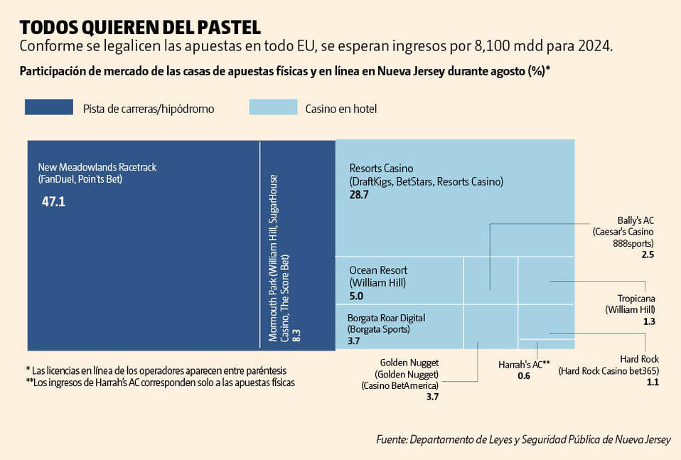 Para los recién llegados al mercado de apuestas, esto es demasiado bueno para ser verdad. “Es una oportunidad que se presenta una vez en la vida”, dice Jason Robins, director ejecutivo de fantasía DraftKings, que tiene la segunda mayor participación de ingresos de apuestas deportivas en Nueva Jersey. “Aquí hay un mercado que pasará a estar regulado, en la economía más grande del mundo”.