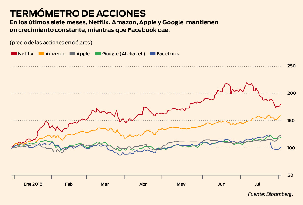 Las acciones de Apple subieron después de un sólido informe de resultados, convirtiendo a la compañía en la primera en alcanzar una valoración de un millón de millones de dólares (mdd). Una semana antes, las acciones de Facebook se desplomaron por un pronóstico pesimista, con lo que se eliminaron casi 120,000 mdd de su valor en Wall Street, la mayor pérdida de valor en un día en la historia para una compañía de Estados Unidos.