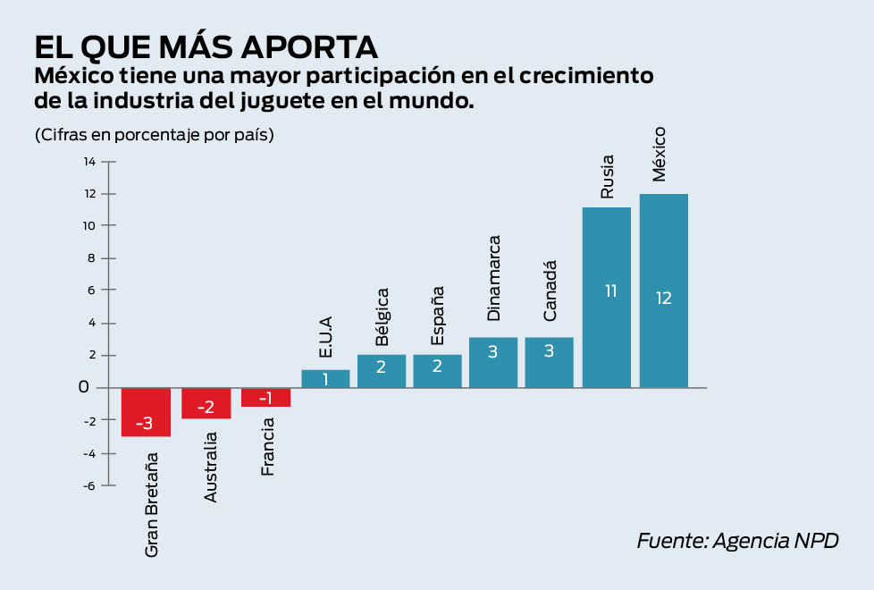 El sector del juguete en el mundo tuvo ganancias superiores a los 47,000 mdd, que si bien solo representó un crecimiento de 1%, fueron 12 mercados los que más aportaron al resultados, donde México fue quien representó 12% de las ganancias en todo el mundo, seguido por Rusia, Dinamarca y Canadá, con 11, 3 y 3%, respectivamente.