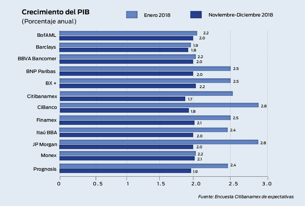 Por su parte, el sector bancario como Bank of America MerrillLynch, Barclays, CIBanco, BBVABancomer, Citibanamex, Finamex, JP Morgan, Scotiabank, BNP Paribas, BX+, Itaú BBA, Monex y Prognosis bajaron sus previsiones para 2019 a lo largo de este año, según la encuesta Citibanamex de expectativas. Estas 13 instituciones preveían en enero un crecimiento promedio del PIB de 2.45%. Para noviembre y diciembre, la cifra bajó a 1.97%.