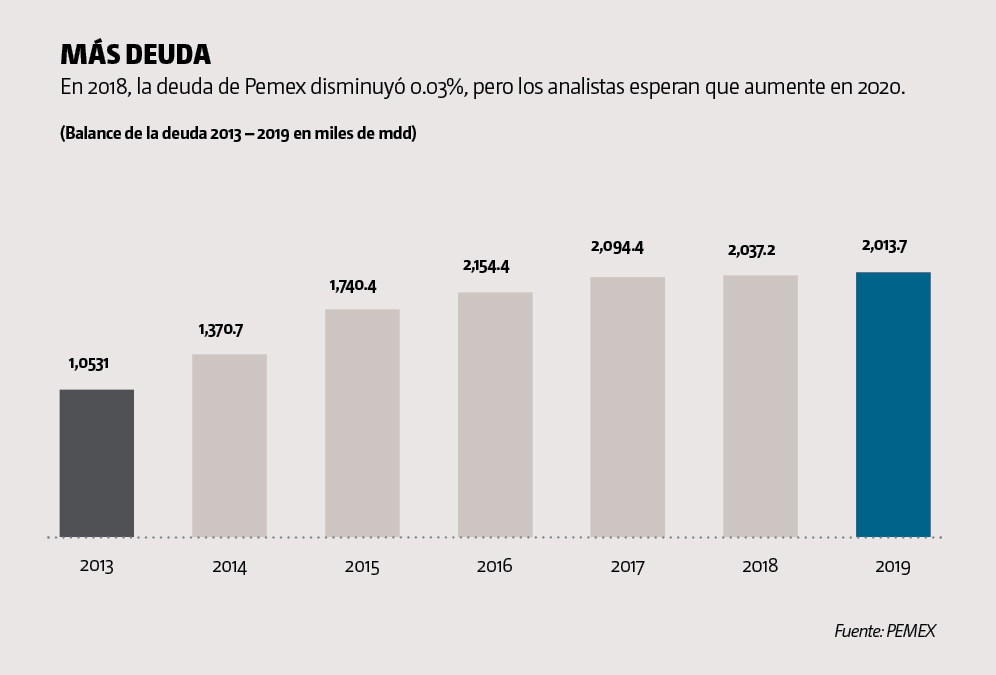Al problema de baja inversión y poca eficiencia, se suma el alto endeudamiento de Pemex. “Calculamos que Pemex necesitará al menos 10,000 mdd para cubrir sus necesidades de financiamiento”, detalla Almeida. “Una parte sería para cubrir la deuda que está venciendo y la otra deuda adicional (inversión)”, agrega la analista de Moody’s.