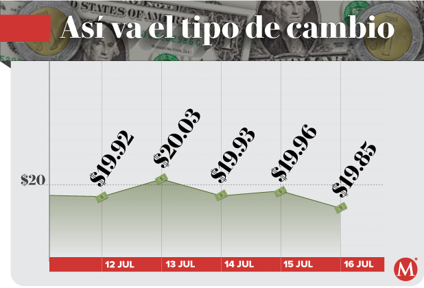 La directora de análisis económico-financiero de Banco BASE, Gabriela Siller, explicó que el peso inicia la sesión con una apreciación de 0.40 por ciento u 8.06 centavos, cotizando alrededor de 19.86 pesos por dólar, con el tipo de cambio tocando un mínimo de 19.85 y un máximo de 19.95 pesos.