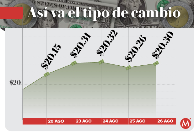 Banco Base explicó en un reporte que el peso inicia la sesión con una depreciación de 0.34 por ciento o 6.9 centavos, cotizando alrededor de 20.31 pesos por dólar, con el tipo de cambio tocando un mínimo de 20.21y un máximo de 20.33 pesos.