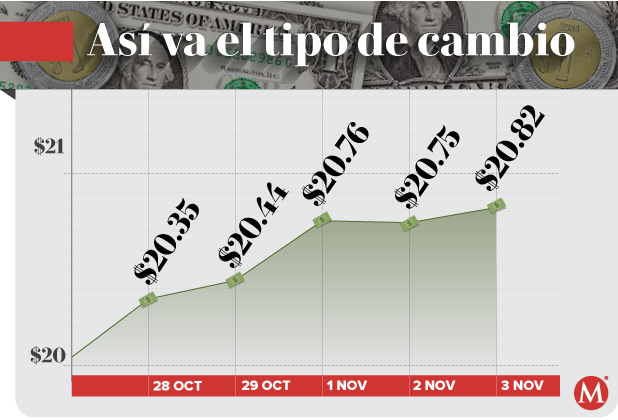 Banco Base publicó en su reporte que el peso inicia la sesión con una depreciación cotizando alrededor de 20.81 pesos por dólar, con el tipo de cambio tocando un mínimo de 20.72 y un máximo de 20.83 pesos.