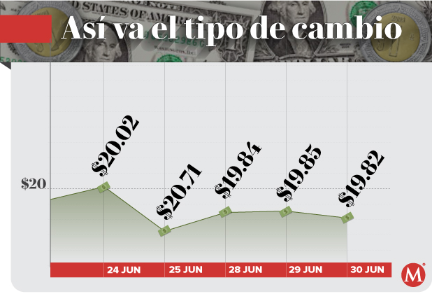"Hoy es la cuarta sesión consecutiva que el tipo de cambio muestra un desempeño lateral, manteniéndose la mayor parte del tiempo en un canal entre 19.80 y 19.85 pesos por dólar, señal de que no hay claridad en el mercado sobre la dirección que seguirá el tipo de cambio durante la segunda mitad del año", refirió.