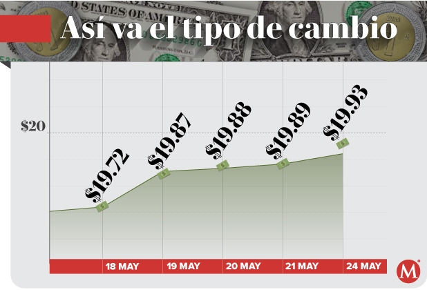 El Banco de México (Banxico) registró la sesión previa un tipo de cambio de 19.95 pesos por dólar.