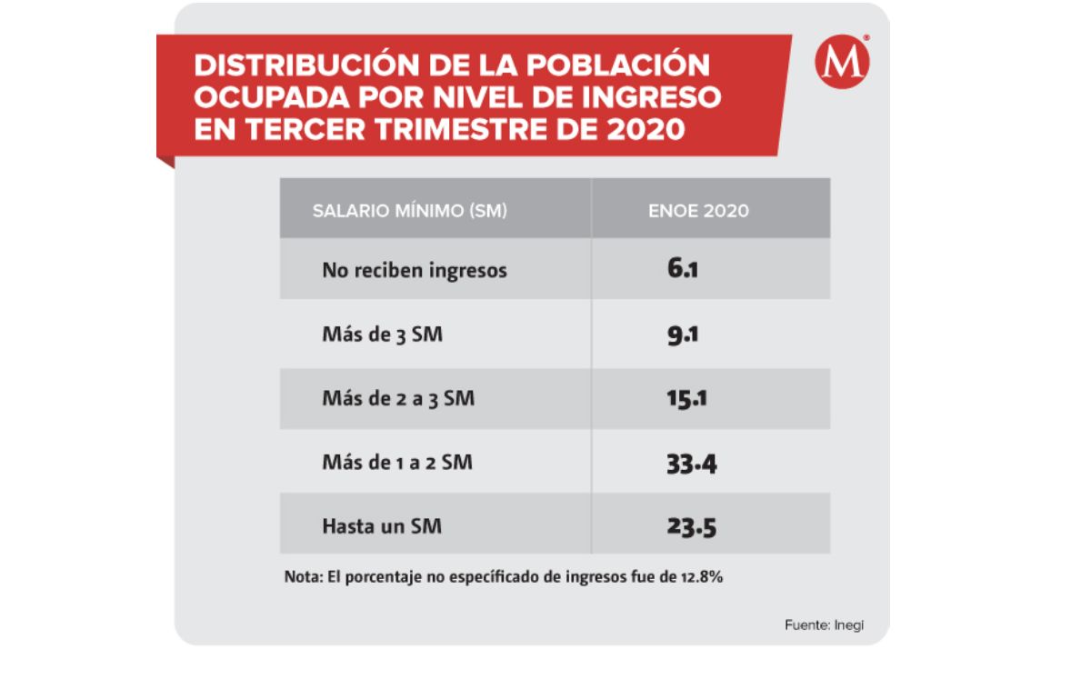 La más reciente Encuesta Nacional de Ocupación y Empleo Nueva Edición (ENOEN), publicada por el Inegi para el tercer trimestre del año, revela que la mayoría (33.4 por ciento) de las personas que trabajan, y reciben un salario, ganan entre uno y dos salarios mínimos mensuales, es decir, entre 3 mil 396 y 7 mil 393 pesos.