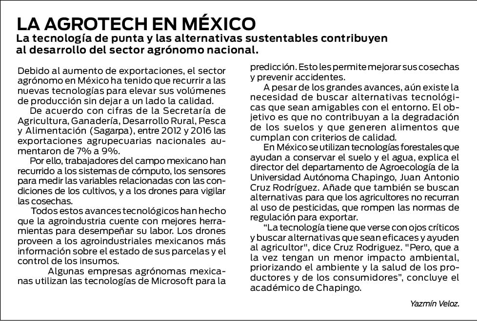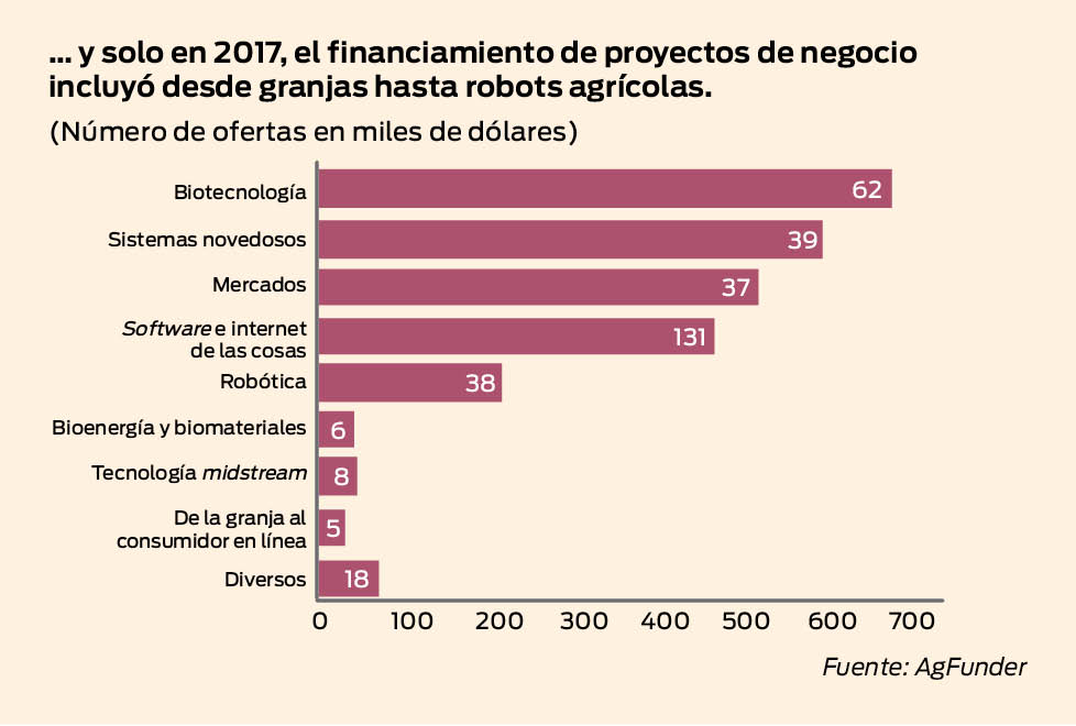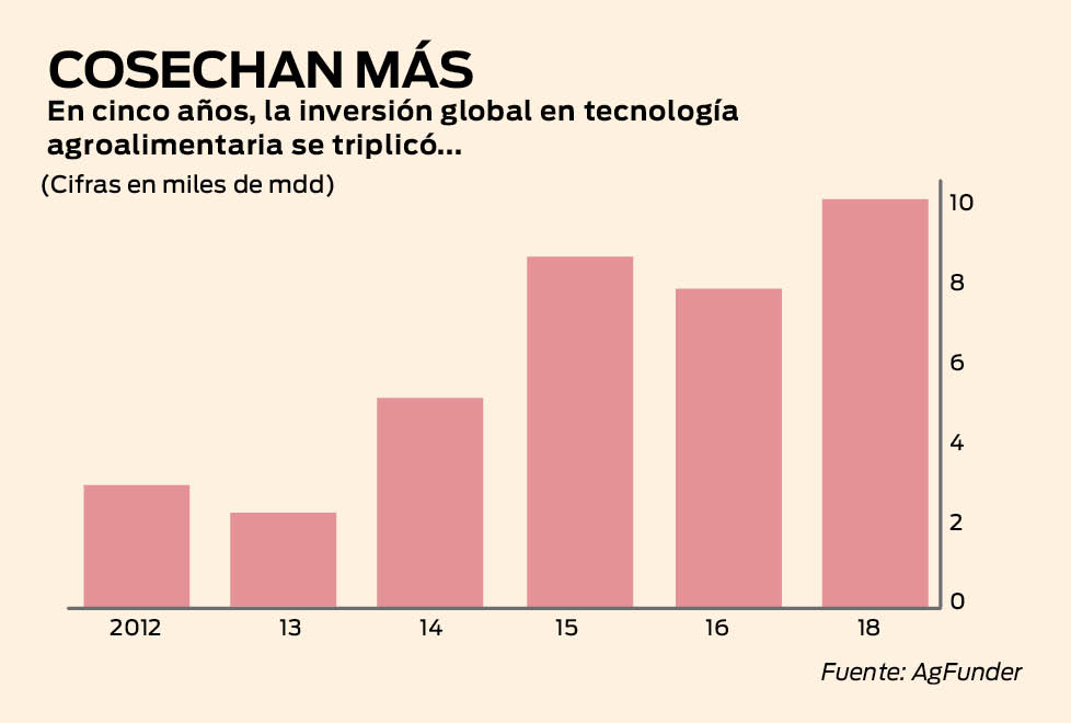 De 2012 a 2017, la inversión global en tecnología de alimentos, desde sistemas de administración agrícola hasta robótica y mecanización, aumentó más del triple para llegar a 10,000 millones de dólares (mdd), de acuerdo con AgFunder, un tracker (firma de seguimiento) de capital de riesgo.