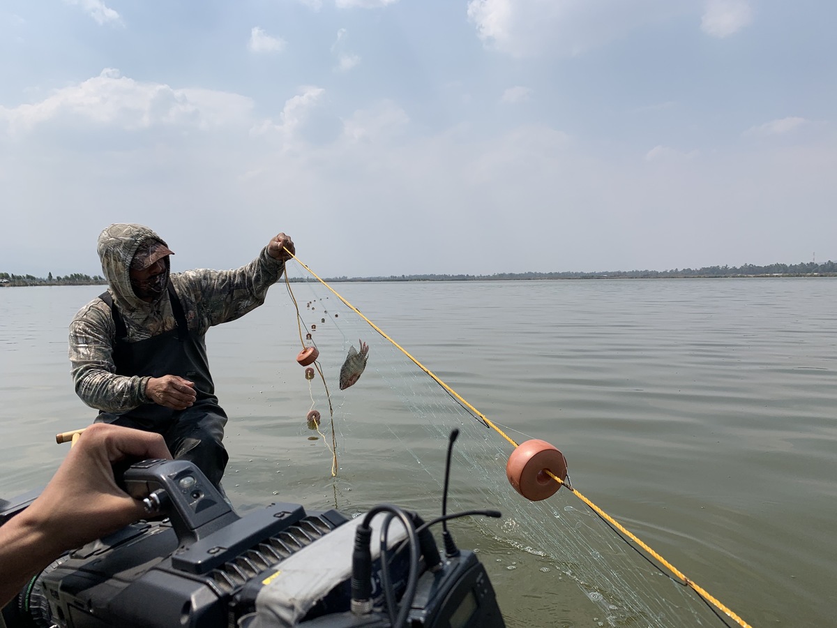 Para atrapar mojarras, algunos habitantes dejan grandes extensiones de redes sostenidas por pequeñas boyas.