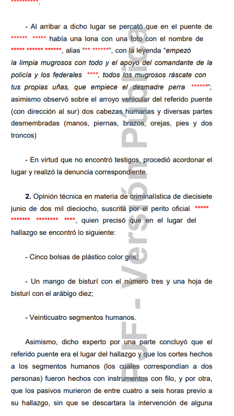 Al llegar, ubicó una manta colgada sobre el puente peatonal con un mensaje dirigido a Jorge Flores Concha El Tortas. El policía relató que “sobre el arroyo vehicular del referido puente (con dirección al sur) –observó- dos cabezas humanas y diversas partes desmembradas (manos, piernas, brazos, orejas, pies y dos troncos)”. De inmediato acordonó el área.