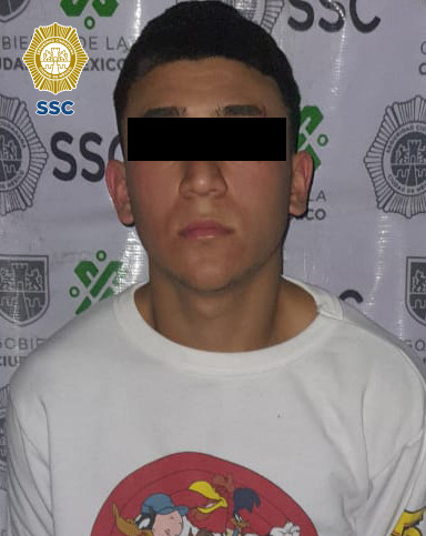 Este joven de 18 años fue detenido en la alcaldía Venustiano Carranza, cuenta con tres detenciones previas, una en 2019 por el delito de robo a conductor, y dos en 2020 por robo a negocio y delitos contra la salud, y está posiblemente relacionado con un homicidio ocurrido en julio de 2020, en la alcaldía Gustavo A. Madero.