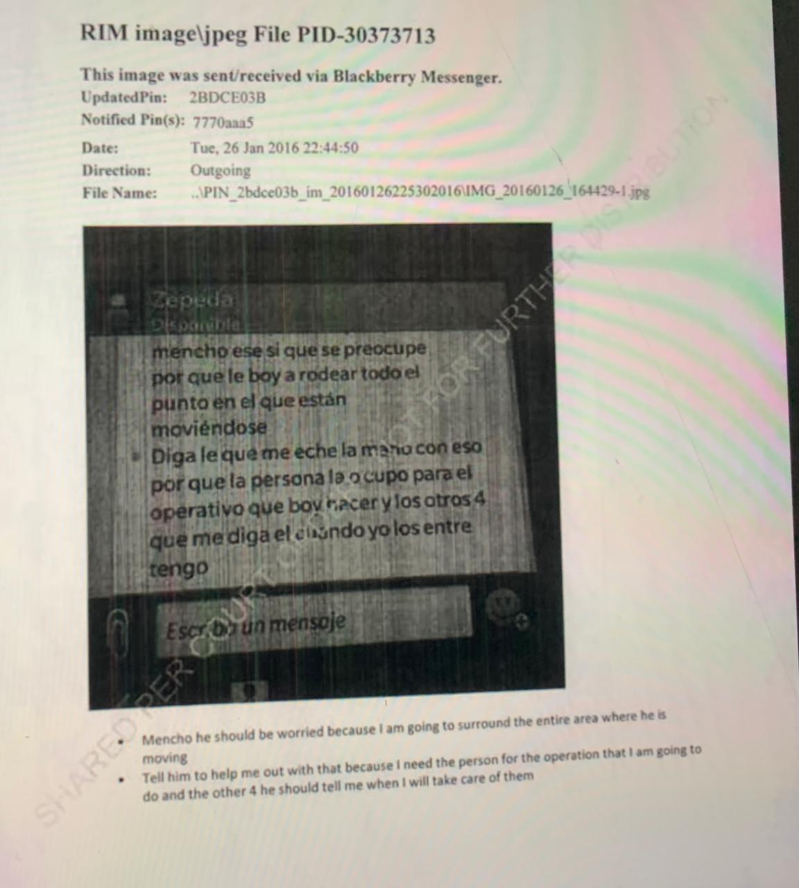 De acuerdo con el expediente dado a conocer este viernes por la cancillería, se revelan imágenes de chats de BlackBerry realizados entre un usuario guardado como Zepeda, quien autoridades estadunidenses ubican como el general Cienfuegos, y Daniel Isaac Silva Garate, El H9, sobrino de Juan Francisco Patrón, El H2.
