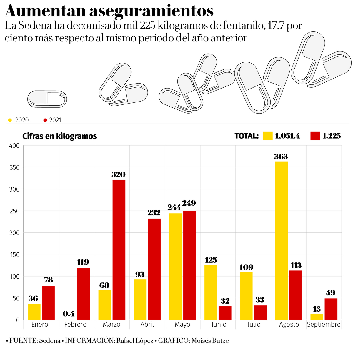 Hasta el 21 de septiembre pasado, las fuerzas de seguridad nacional decomisaron mil 225 kilogramos de esta droga que actualmente se ubica como la más letal en muertes por sobredosis en Estados Unidos.