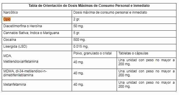 La Tabla de Orientación de Dosis Máximas de Consumo Personal e Inmediato Narcótico destaca lo siguiente: