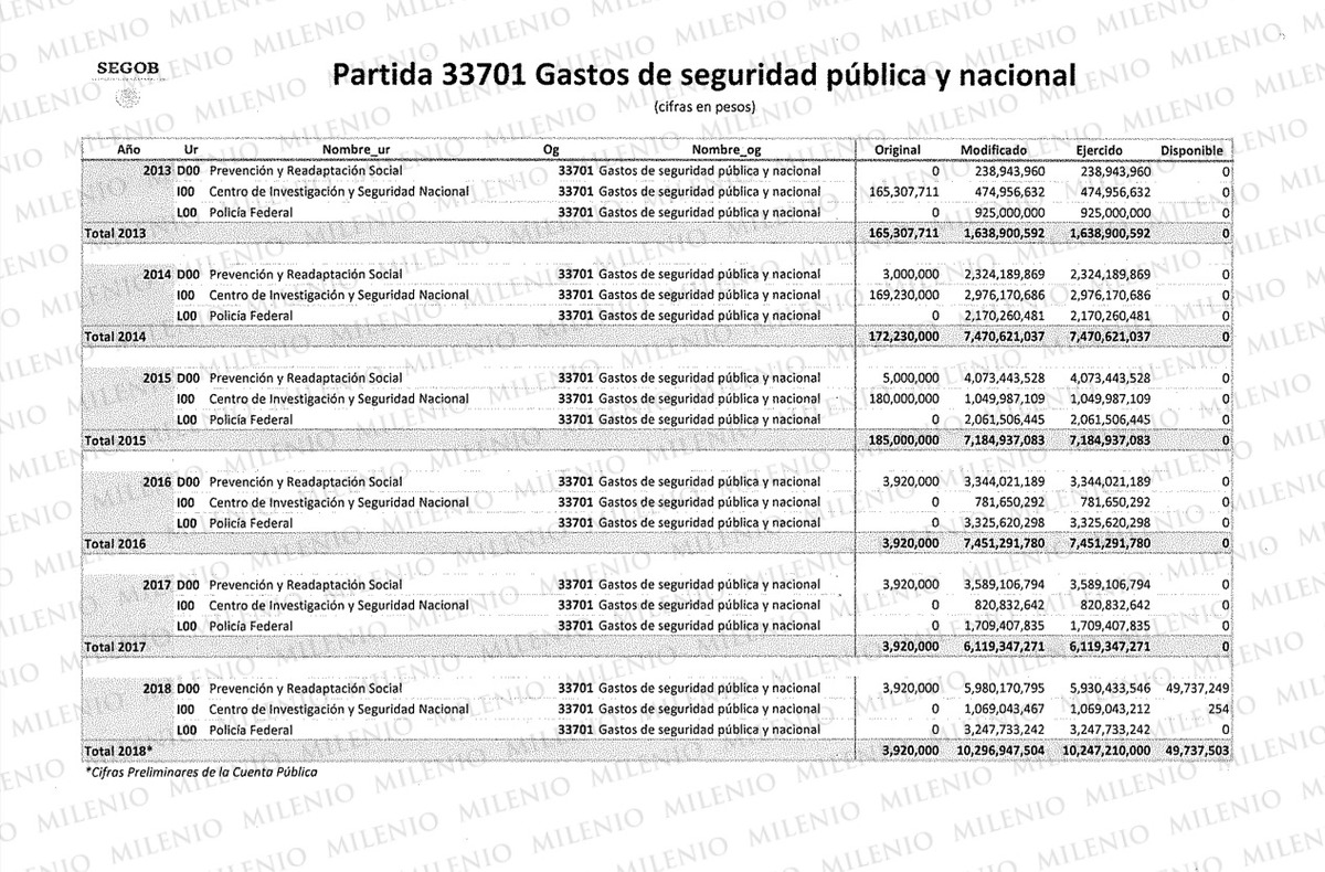 De acuerdo con fuentes de primer nivel en el gabinete de seguridad consultadas por MILENIO, se tiene bajo la lupa a la partida presupuestal 33701, clasificada como “Gastos de Seguridad Pública y Nacional” y que se convirtió en la principal fuente de ingresos del gabinete de seguridad, encabezado por el secretario de Gobernación, Miguel Ángel Osorio Chong.