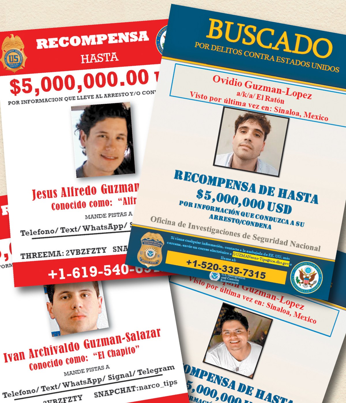 Mientras tanto en Estados Unidos, los herederos del Cártel de Sinaloa son buscados por tráfico de drogas y lavado de dinero, entre otros cargos, tal como su padre Joaquín El Chapo Guzmán quien fue sentenciado a cadena perpetua por estos mismos delitos.
