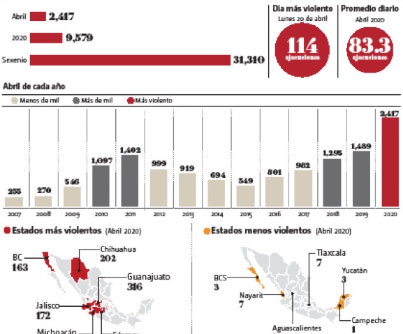 El día más violento del mes fue el pasado lunes 20 de abril, cuando se registraron 114 ejecuciones. En promedio, en abril murieron 80.5 personas al día a manos del crimen organizado.