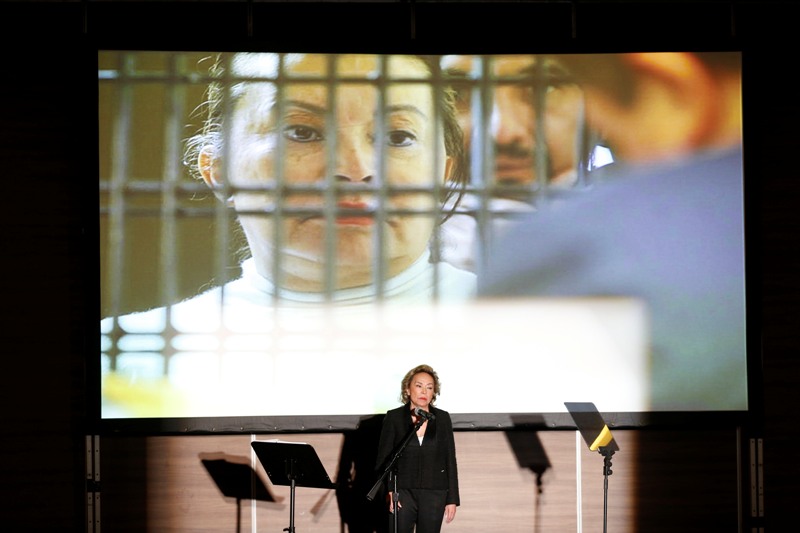 En conferencia de prensa en un hotel en Polanco, mostró en una pantalla la foto donde aparece tras las rejas durante una audiencia.