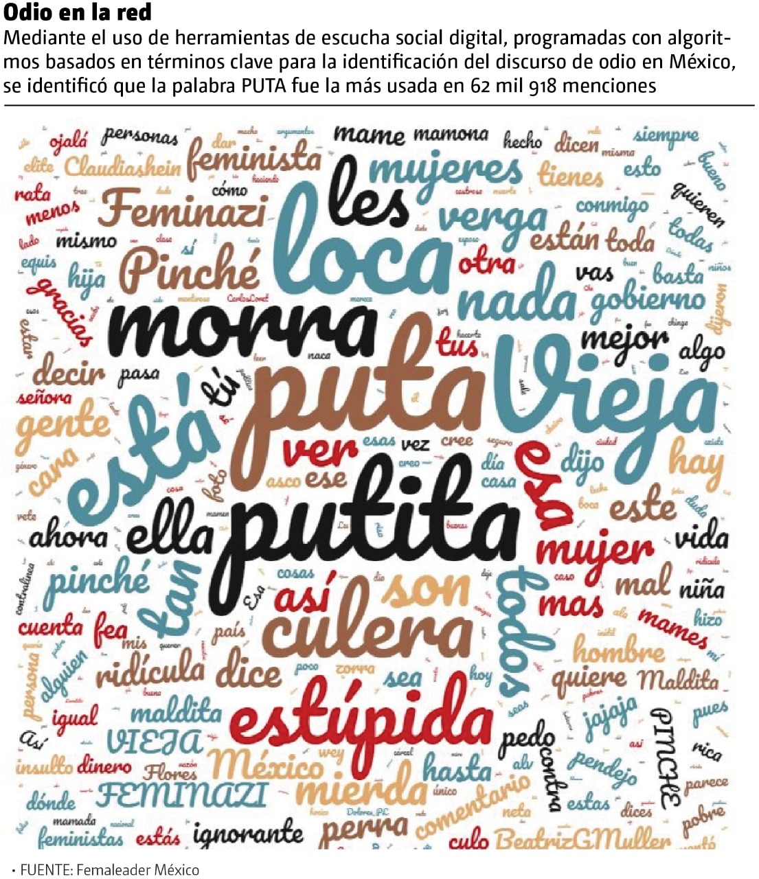 De acuerdo con una investigación realizada por la organización Femaleader, éste es el término con el que más se ofende y desacredita a las mujeres en redes sociales, blogs, videos y todo tipo de contenido digital, seguido por conceptos como “putita”, “vieja”, “loca”, “morra”, “estúpida” y “culera”.