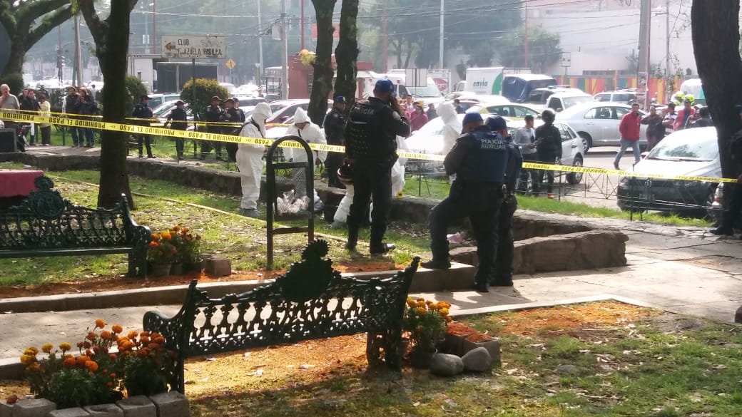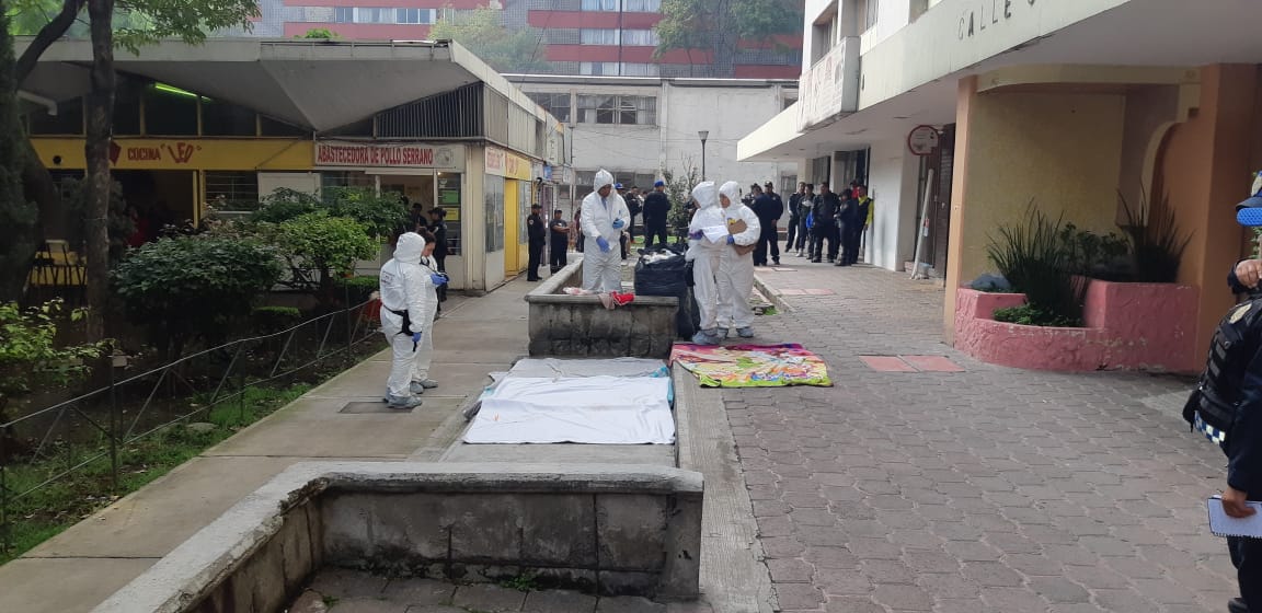 Los oficiales rastrean la zona y encuentran una cobija y sábanas con manchas de sangre frente a la entrada B del edificio Allende. Una mujer dice que el cadáver es de su hermana.
