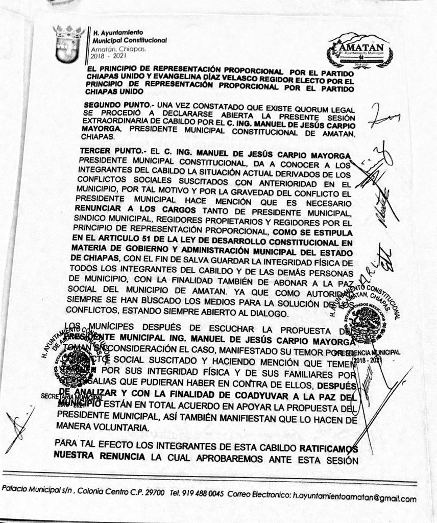 Según el acta de sesión extraordinaria del cabildo, fechada el 31 de enero, Carpio Mayorga manifestó que “la situación actual, derivada de los conflictos sociales suscitados con anterioridad en el municipio” y por la “gravedad del conflicto” son necesarias las renuncias a los cargos de presidente municipal, síndico municipal y regidores.