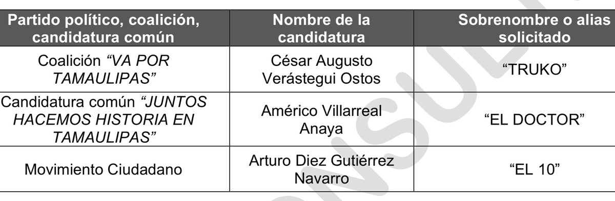 Los tres aspirantes a la gubernatura de Tamaulipas contarán con un sobrenombre en las boletas electorales. La solicitud de sus respectivos partidos políticos la presentaron ante el Instituto Electoral de Tamaulipas (Ietam).