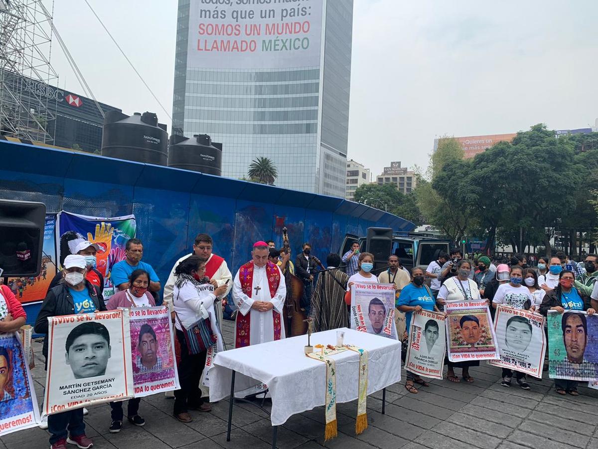 Un grupo de padres de familia de los 43 normalistas de Ayotzinapa celebran una misa, previo a la movilización que iniciará a las 16:00 horas por el sexto aniversario de la desaparición de los estudiantes.