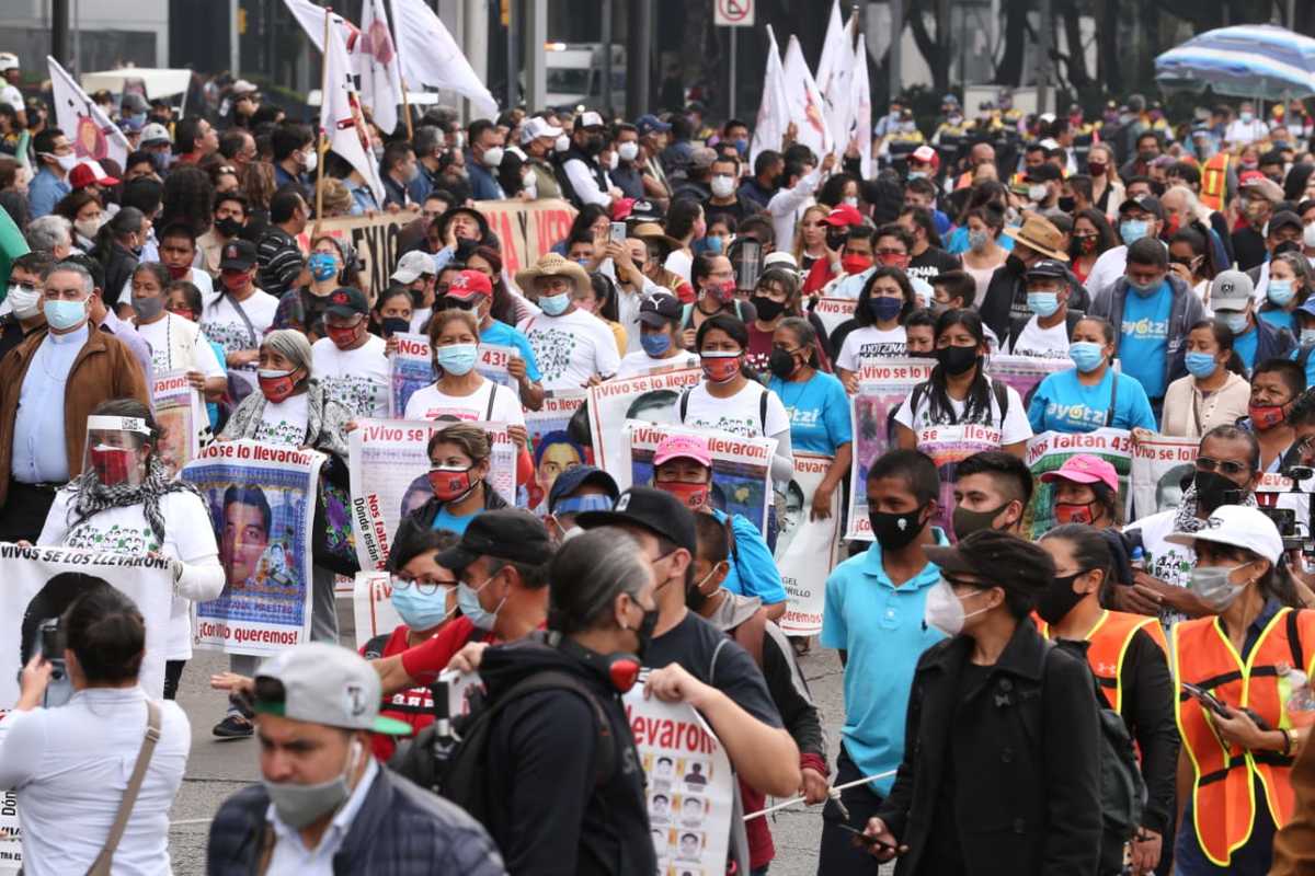 Padres de familia de los 43 normalistas de Ayotzinapa encabezan la movilización por el sexto aniversario de la desaparición de los estudiantes.