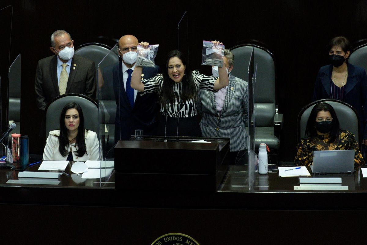 Por el PRI, la diputada Cynthia López Castro alertó sobre los daños a la salud por el consumo de la mariguana y exhibió en tribuna dos bolsas de plástico transparente con 28 gramos de… orégano.