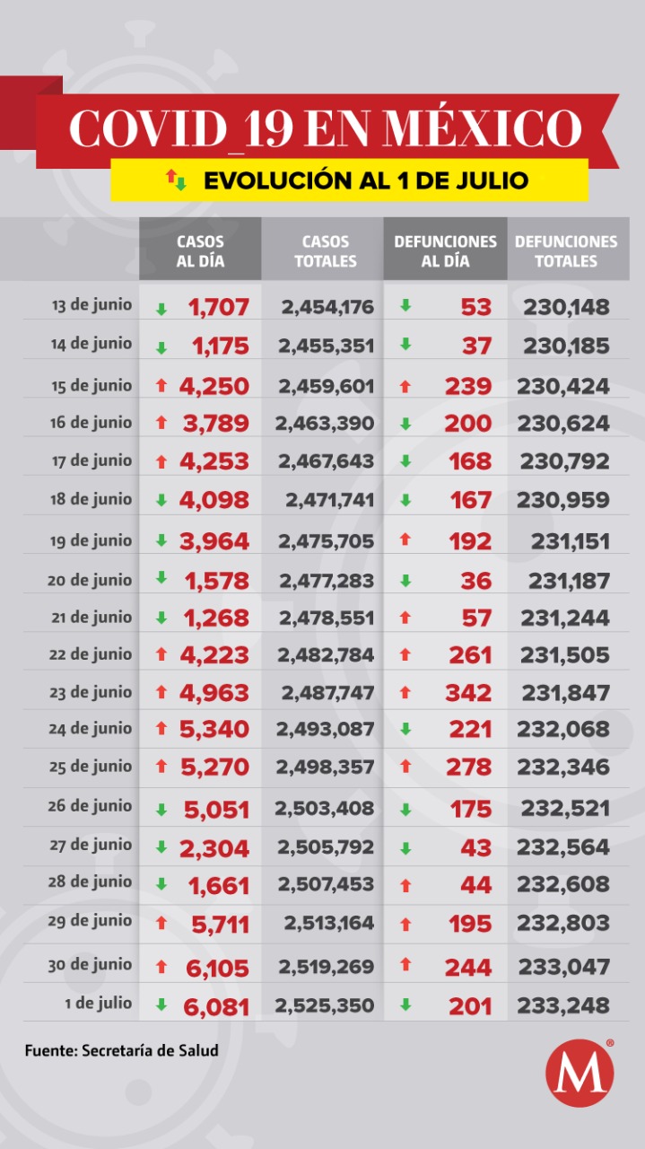 México suma 233 mil 248 muertes por covid-19, 201 más que ayer y registra 2 millones 525 mil 350 casos acumulados de coronavirus SARS-CoV-2, de acuerdo al informe técnico de la Secretaría de Salud dado a conocer este jueves.