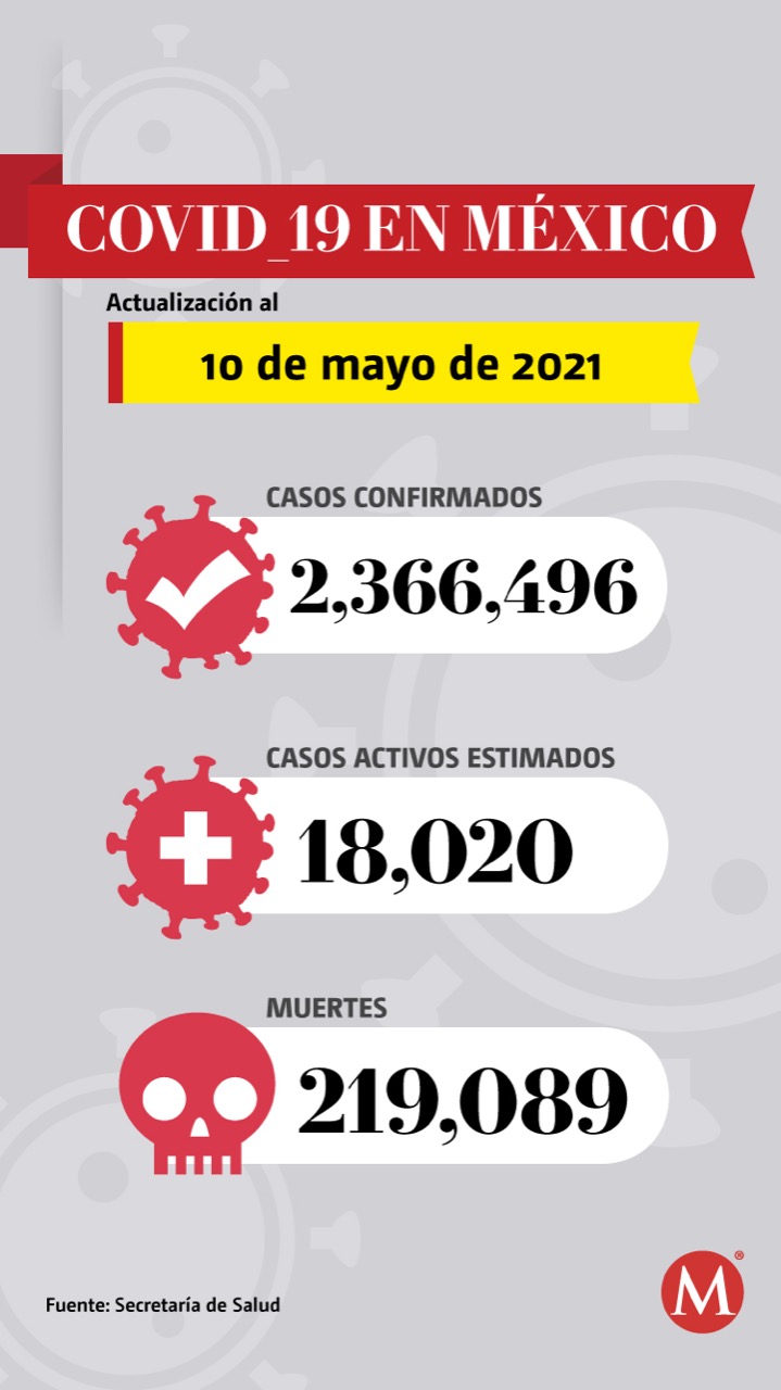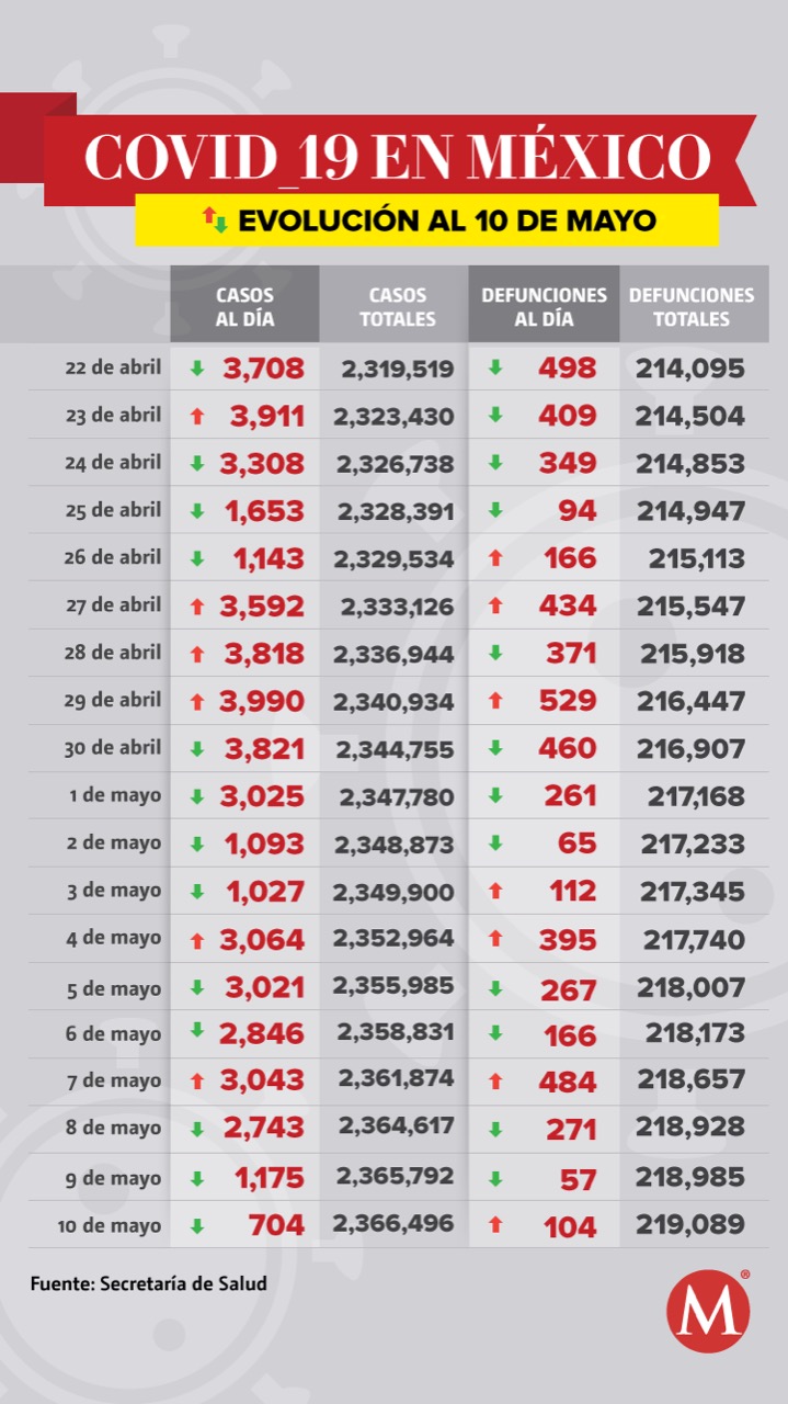 La Secretaría de Salud informó este lunes sobre las cifras de covid-19 en México, con corte de este 10 de mayo, donde se confirmaron 104 decesos en las últimas 24 horas.