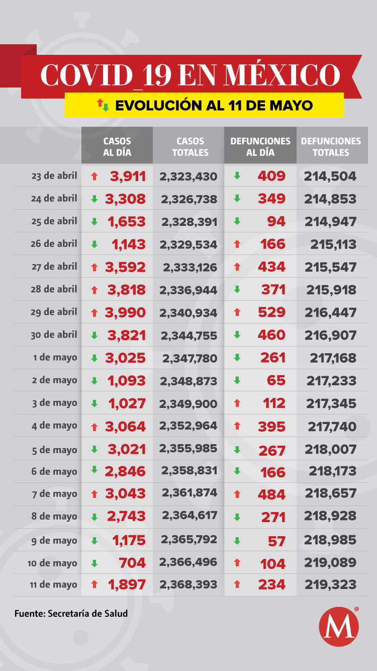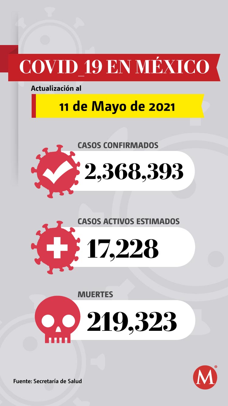 México acumula este martes 11 de mayo 219 mil 323 muertes por coronavirus, 234 decesos más que ayer, así como 2 millones 555 mil 46 casos estimados, de acuerdo con el informe diario de la Secretaría de Salud presentado por Alethse de la Torre Rosas, directora general del Centro Nacional para la Prevención del VIH y el Sida (Censida).