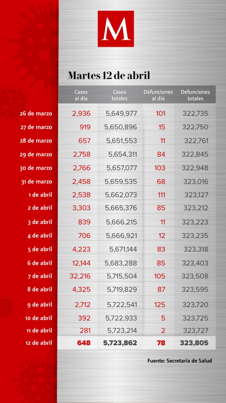 México sumó 78 nuevas muertes por coronavirus y 648 casos en las últimas 24 horas, con lo que se acumulan 323 mil 805 defunciones y 5 millones 723 mil 862 contagios, de acuerdo con el informe de la Secretaría de Salud.